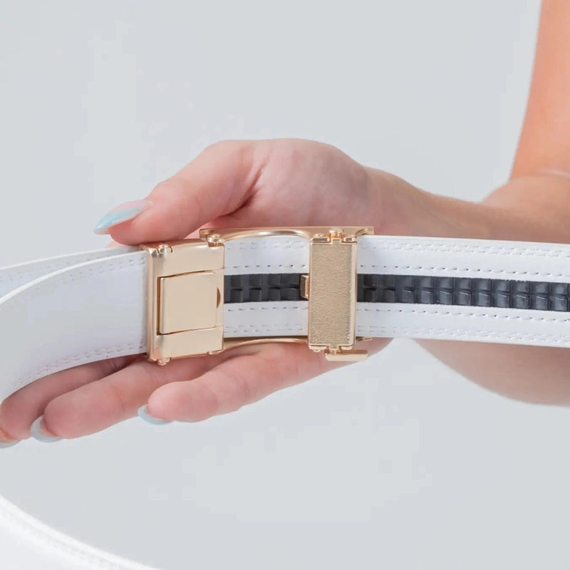 Il vous suffit d’insérer la sangle dans la boucle et de tirer : la ceinture se règle automatiquement à la précision parfaite. Après un repas ou lorsque vous souhaitez un léger relâchement, un simple clic permet d’ajuster instantanément le confort.